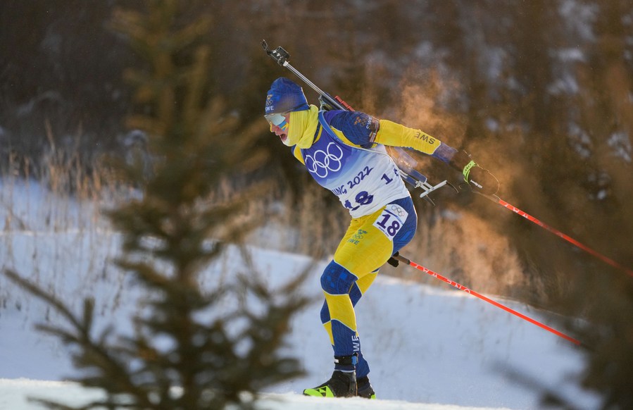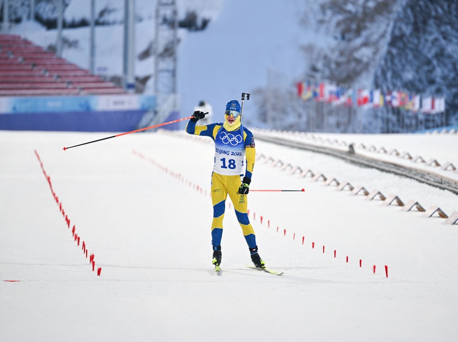 Martin Ponsiluoma of Sweden approaches the finish line during biathlon men's 15km mass start of Beijing 2022 Winter Olympics at National Biathlon Centre in Zhangjiakou, north China's Hebei Province, Feb. 18, 2022. (Xinhua/Mu Yu)