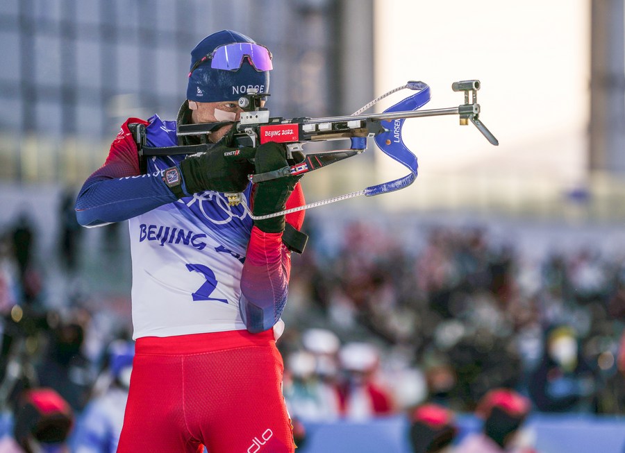Johannes Thingnes Boe of Norway competes during biathlon men's 15km mass start of Beijing 2022 Winter Olympics at National Biathlon Centre in Zhangjiakou, north China's Hebei Province, Feb. 18, 2022. (Xinhua/Jiang Hongjing)