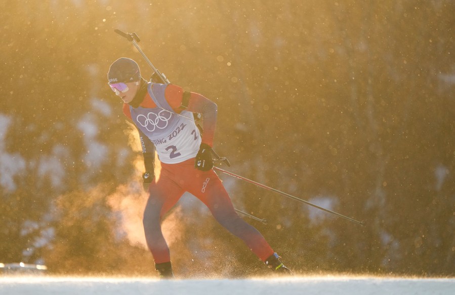 Johannes Thingnes Boe of Norway competes during biathlon men's 15km mass start of Beijing 2022 Winter Olympics at National Biathlon Centre in Zhangjiakou, north China's Hebei Province, Feb. 18, 2022. (Xinhua/Peng Ziyang)