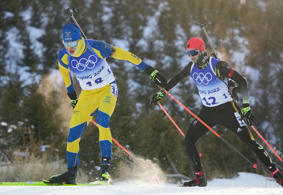 Martin Ponsiluoma (L) of Sweden and Benedikt Doll of Germany compete during biathlon men's 15km mass start of Beijing 2022 Winter Olympics at National Biathlon Centre in Zhangjiakou, north China's Hebei Province, Feb. 18, 2022. (Xinhua/Jiang Hongjing)