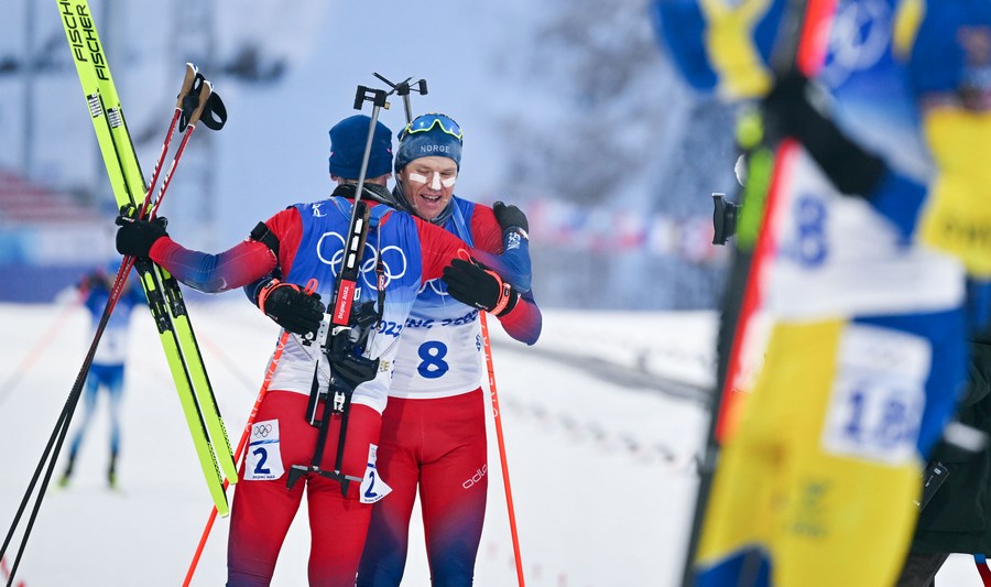 Johannes Thingnes Boe (front) and Vetle Sjaastad Christiansen of Norway celebrate after biathlon men's 15km mass start of Beijing 2022 Winter Olympics at National Biathlon Centre in Zhangjiakou, north China's Hebei Province, Feb. 18, 2022. (Xinhua/Mu Yu)