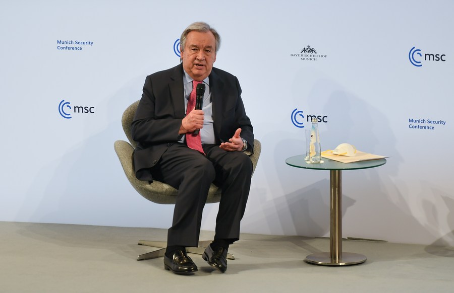 UN Secretary-General Antonio Guterres speaks during the 58th Munich Security Conference in Munich, Germany, on Feb. 18, 2022. (Xinhua/Lu Yang)