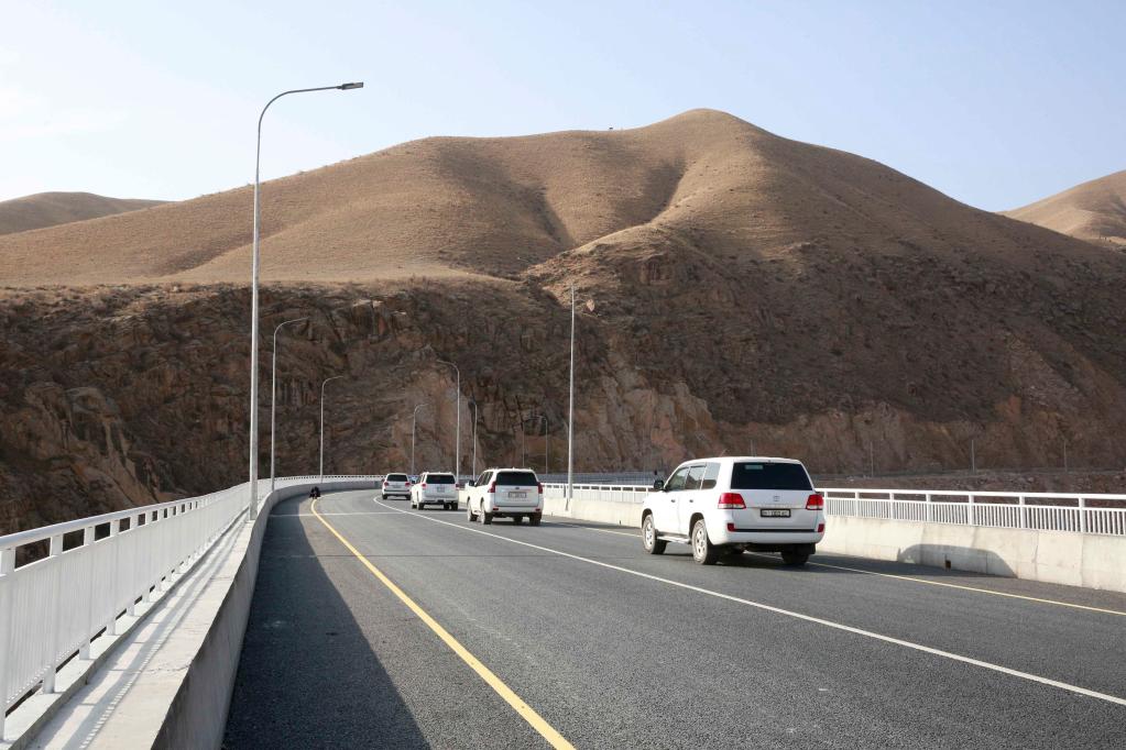 Photo taken on Nov. 10, 2021 shows vehicles running on a bridge completed during the second phase of a new North-South highway project in Kazarman of Jalalabad Region, Kyrgyzstan. (Photo by Roman/Xinhua)