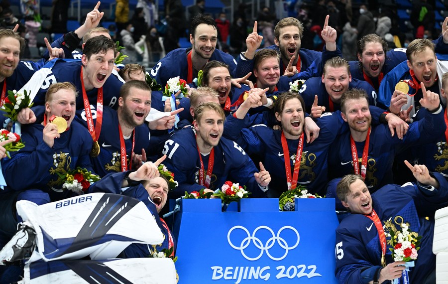Athletes of Finland pose for photo after winning the men's ice hockey gold medal of the Beijing 2022 Winter Olympics at National Indoor Stadium in Beijing, capital of China, Feb. 20, 2022. (Xinhua/Wang Jianwei)