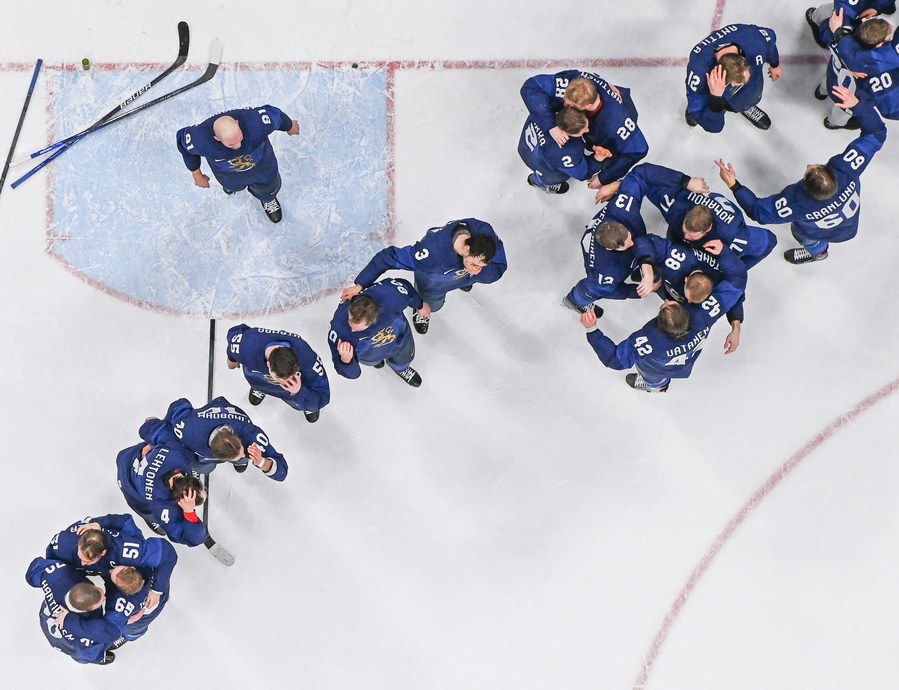 Athletes of Finland celebrate after beating ROC to win their first ever Olympic gold of the men's ice hockey at the Beijing 2022 Winter Olympics at National Indoor Stadium in Beijing, capital of China, Feb. 20, 2022. (Xinhua/Du Yu)
