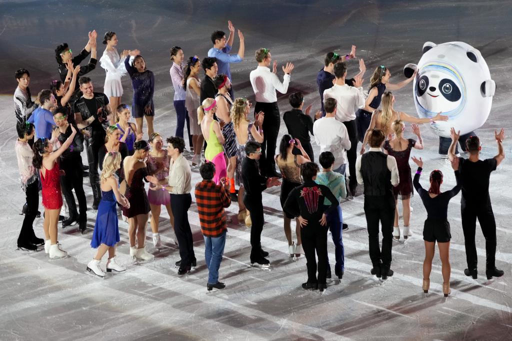 Figure skaters celebrate with the mascot of Beijing 2022 Olympic Winter Games Bing Dwen Dwen after the figure skating gala event of the Beijing 2022 Winter Olympics at Capital Indoor Stadium in Beijing, capital of China, Feb. 20, 2022. (Xinhua/Zhang Yuwei)