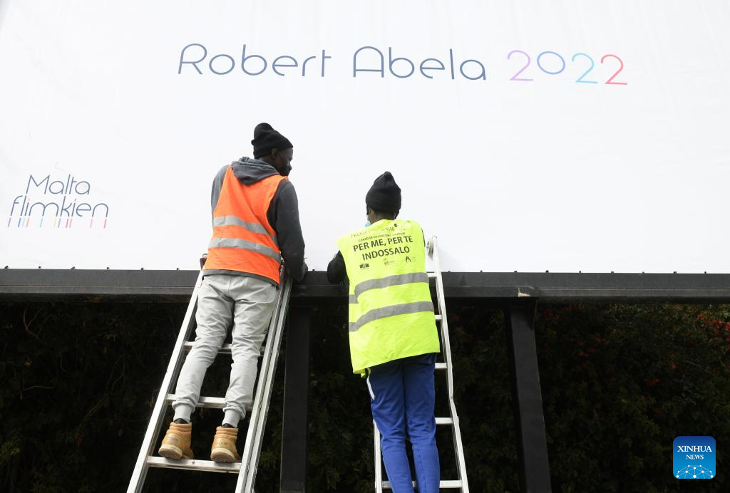 Photo taken on Feb. 20, 2022 shows an election poster for Maltese Prime Minister Robert Abela in Floriana, a town near the capital Valletta, Malta.