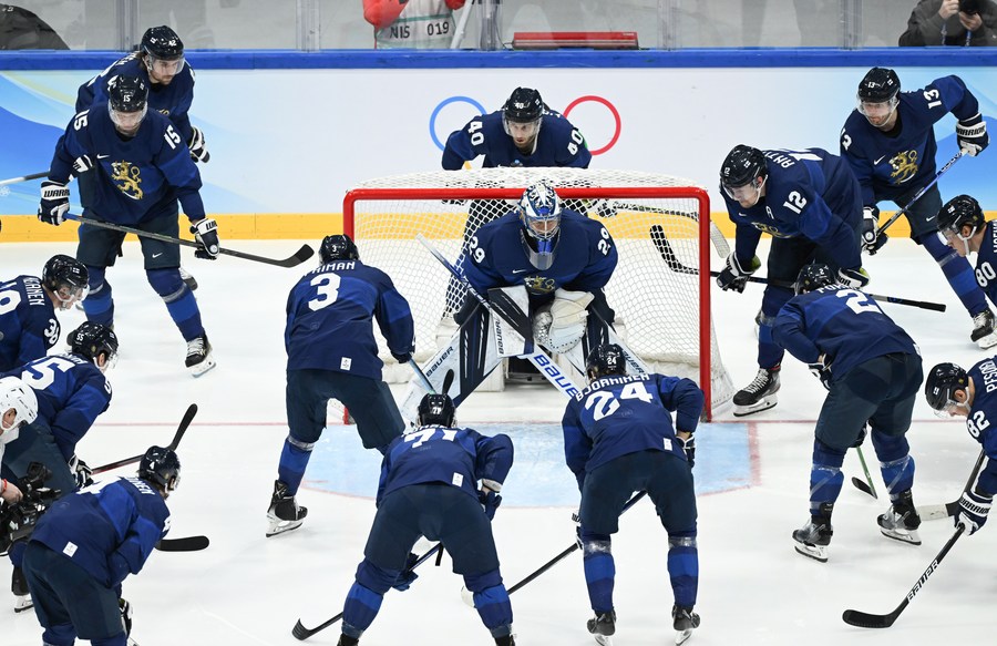 Athletes of Finland react before ice hockey men's gold medal game of Beijing 2022 Winter Olympics between Finland and ROC at National Indoor Stadium in Beijing, capital of China, Feb. 20, 2022. (Xinhua/Wu Wei)