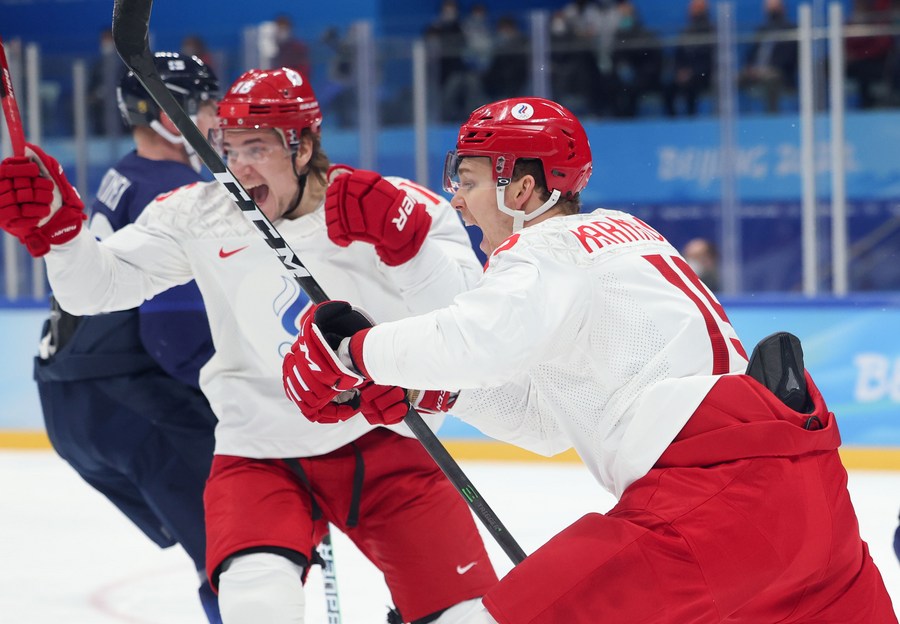Pavel Karnaukhov (R) of ROC reacts during ice hockey men's gold medal game of Beijing 2022 Winter Olympics between Finland and ROC at National Indoor Stadium in Beijing, capital of China, Feb. 20, 2022. (Xinhua/Lan Hongguang)