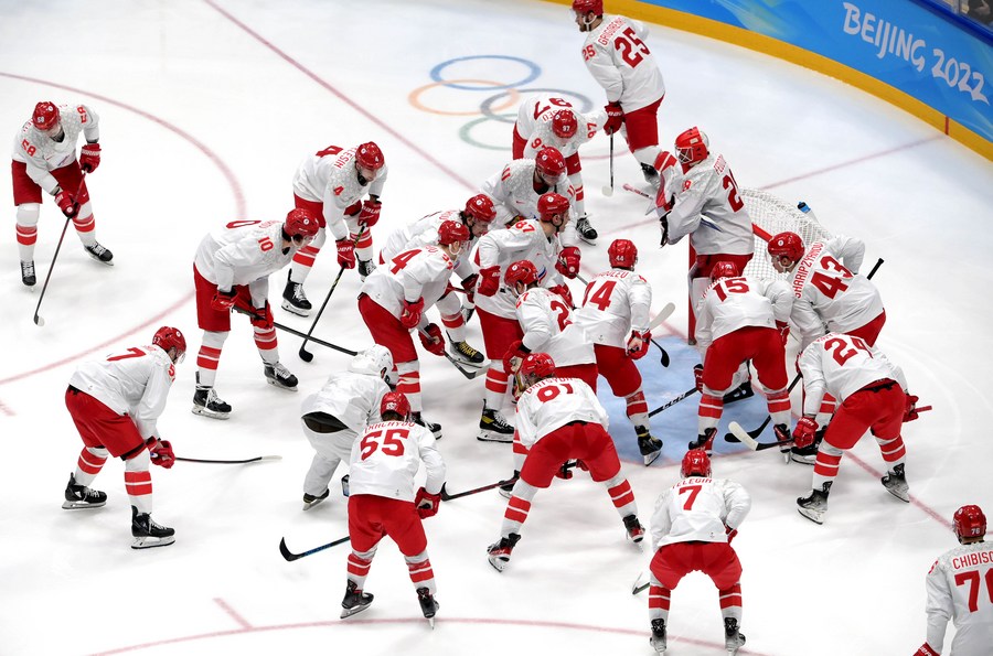 Athletes of ROC react before ice hockey men's gold medal game of Beijing 2022 Winter Olympics between Finland and ROC at National Indoor Stadium in Beijing, capital of China, Feb. 20, 2022. (Xinhua/Li An)