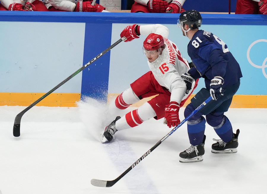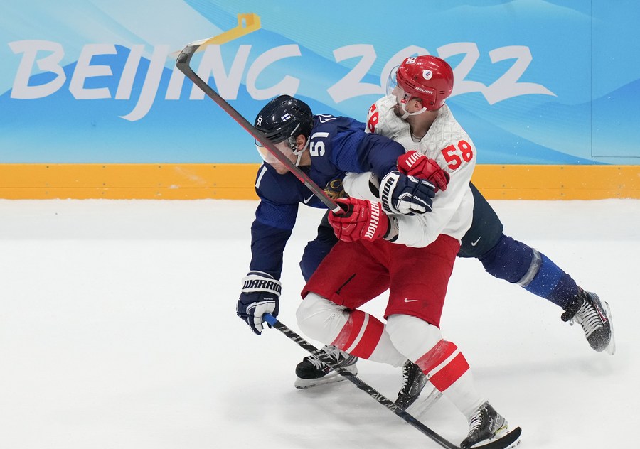 Ville Pokka (1st R) of Finland competes during ice hockey men's gold medal game of Beijing 2022 Winter Olympics between Finland and ROC at National Indoor Stadium in Beijing, capital of China, Feb. 20, 2022. (Xinhua/Wu Wei)