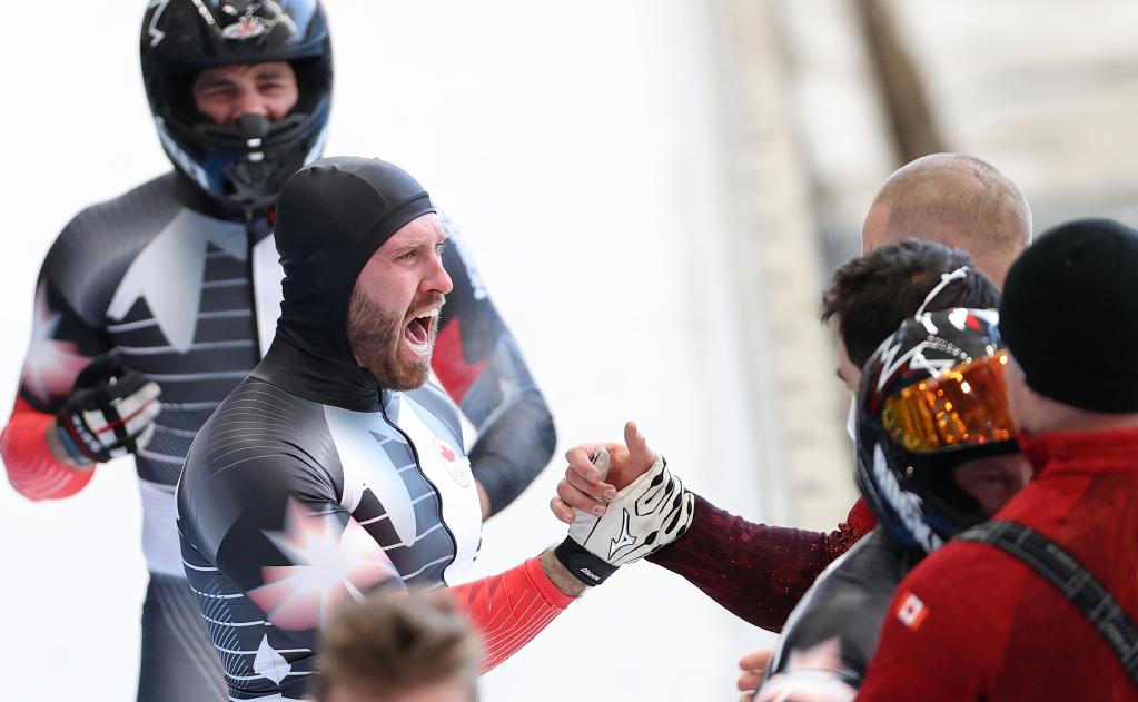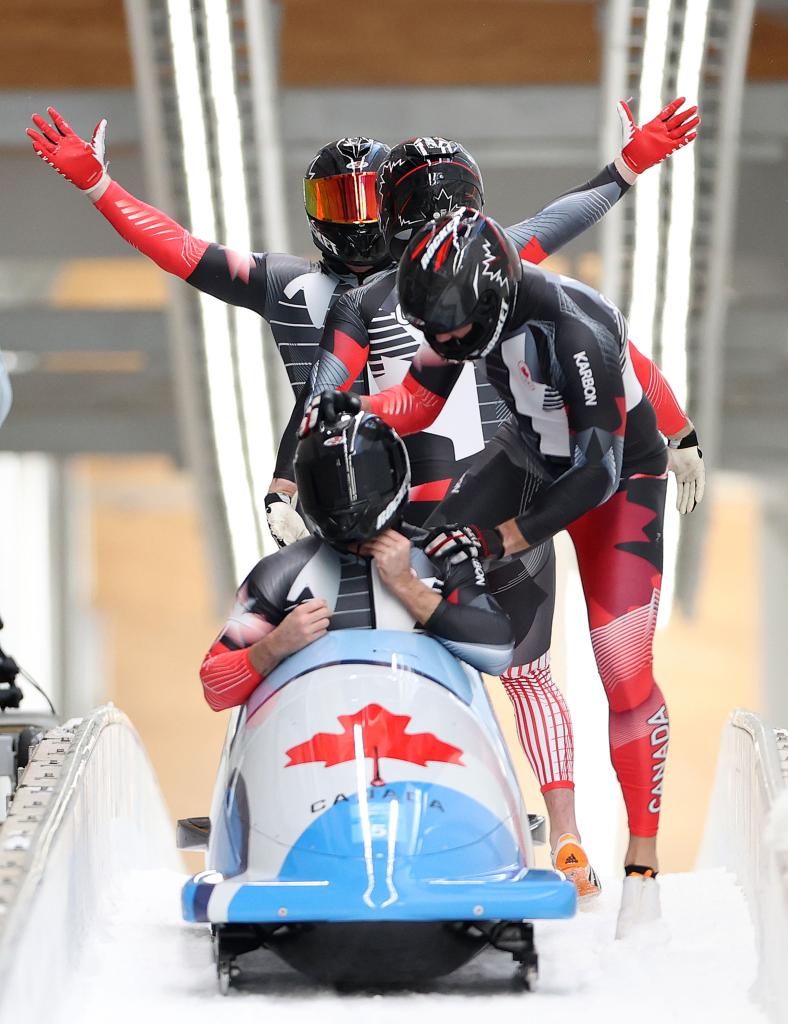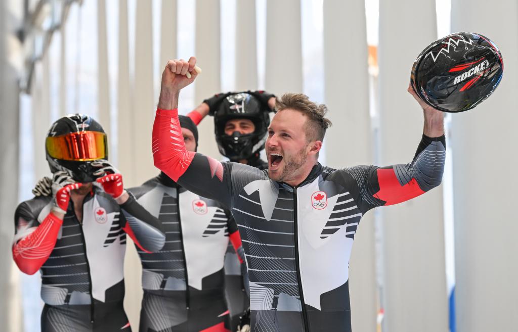 Ryan Sommer (2nd L) of Canada celebrates after the bobsleigh 4-man heat of Beijing 2022 Winter Olympics at National Sliding Centre in Yanqing District, Beijing, capital of China, Feb. 20, 2022. (Xinhua/Yao Jianfeng)