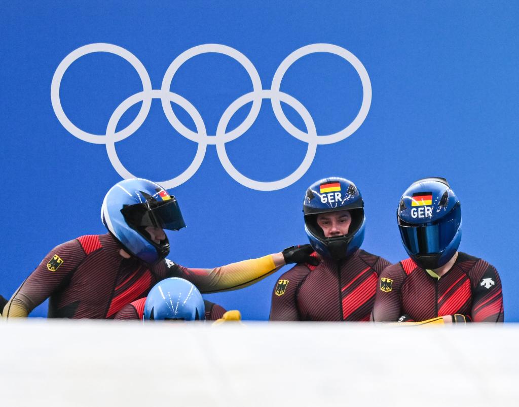 Francesco Friedrich/Thorsten Margis/Candy Bauer/Alexander Schueller of Germany react after the bobsleigh 4-man heat of Beijing 2022 Winter Olympics at National Sliding Centre in Yanqing District, Beijing, capital of China, Feb. 20, 2022. (Xinhua/Yao Jianfeng)