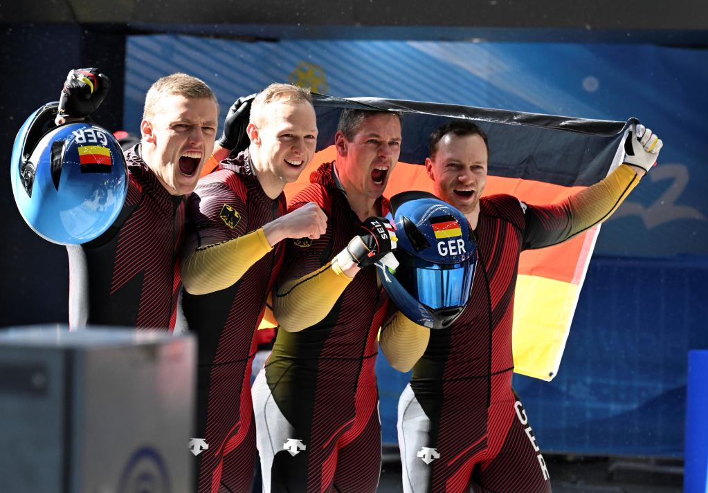 Francesco Friedrich/Thorsten Margis/Candy Bauer/Alexander Schueller of Germany celebrate after the bobsleigh 4-man heat of Beijing 2022 Winter Olympics at National Sliding Centre in Yanqing District, Beijing, capital of China, Feb. 20, 2022. (Xinhua/He Changshan)