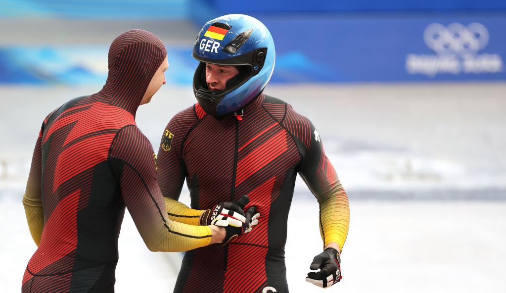 Francesco Friedrich (R) of Germany is seen after the bobsleigh 4-man heat of Beijing 2022 Winter Olympics at National Sliding Centre in Yanqing District, Beijing, capital of China, Feb. 20, 2022. (Xinhua/Yao Jianfeng)