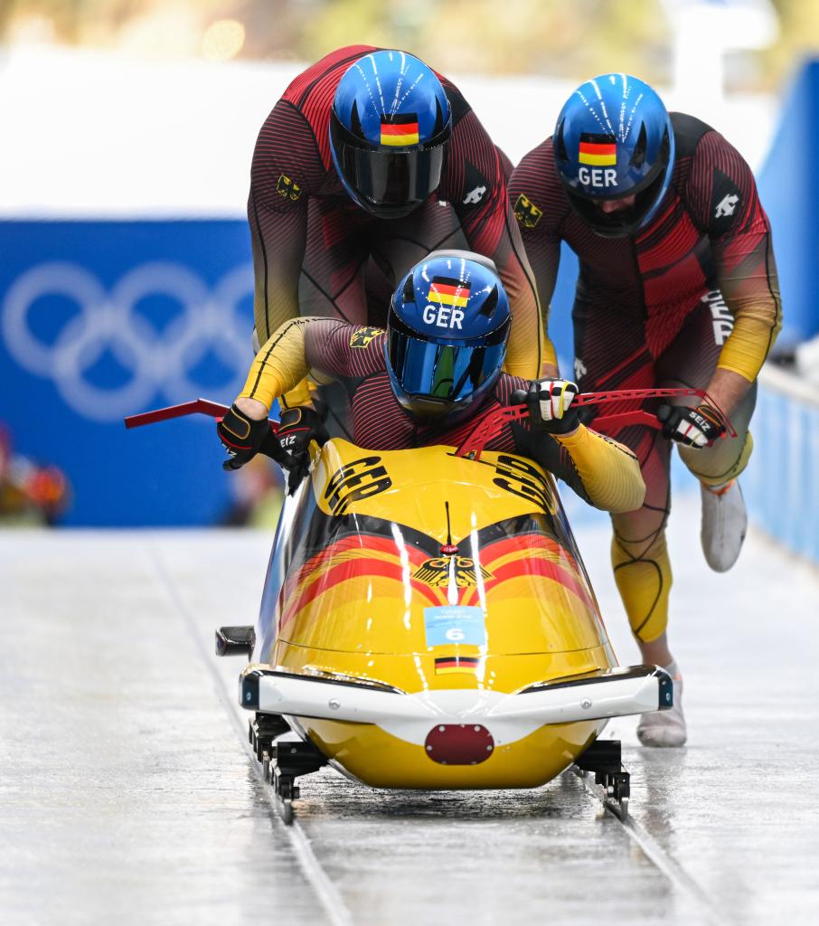 Johannes Lochner/Florian Bauer/Christopher Weber/Christian Rasp of Germany compete during the bobsleigh 4-man heat of Beijing 2022 Winter Olympics at National Sliding Centre in Yanqing District, Beijing, capital of China, Feb. 20, 2022. (Xinhua/Sun Fei)