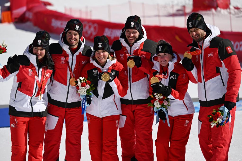 Team Austria pose for photos during the awarding ceremony after the alpine skiing mixed team parallel final of Beijing 2022 Winter Olympics at National Alpine Skiing Centre in Yanqing District, Beijing, capital of China, Feb. 20, 2022. (Xinhua/Chen Bin)
