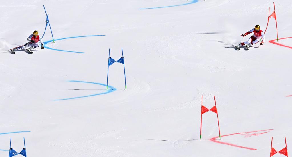Johannes Strolz (R) of Austria and Alexander Schmid of Germany compete during the alpine skiing mixed team parallel final of Beijing 2022 Winter Olympics at National Alpine Skiing Centre in Yanqing District, Beijing, capital of China, Feb. 20, 2022. (Xinhua/Zhang Chenlin)