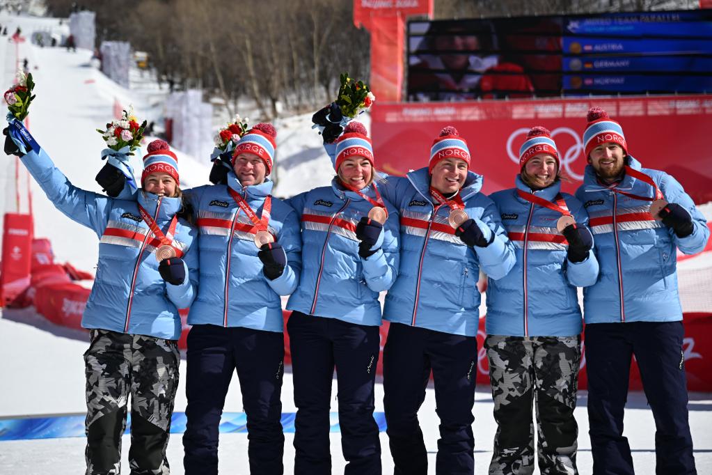 Team Norway pose for photos during the awarding ceremony after the alpine skiing mixed team parallel final of Beijing 2022 Winter Olympics at National Alpine Skiing Centre in Yanqing District, Beijing, capital of China, Feb. 20, 2022. (Xinhua/Chen Bin)