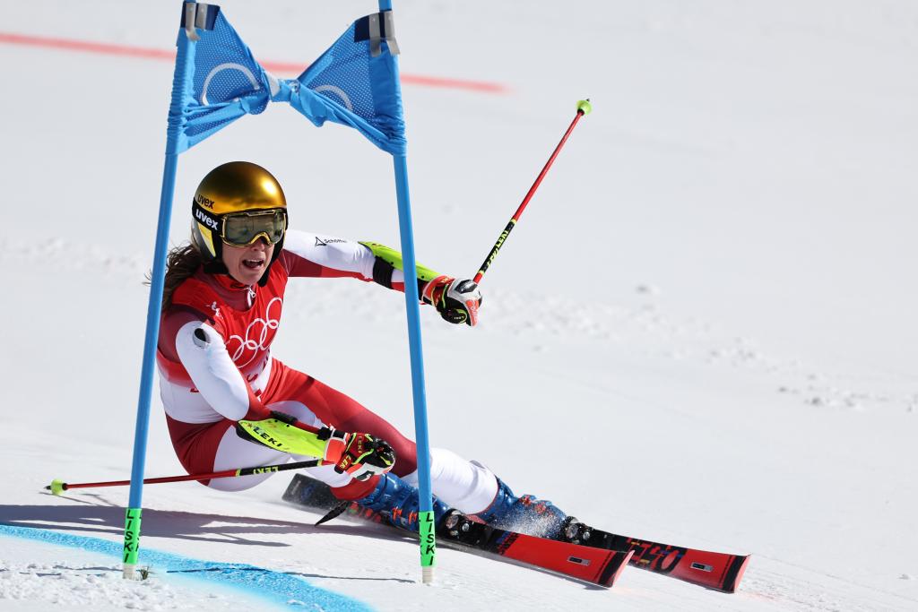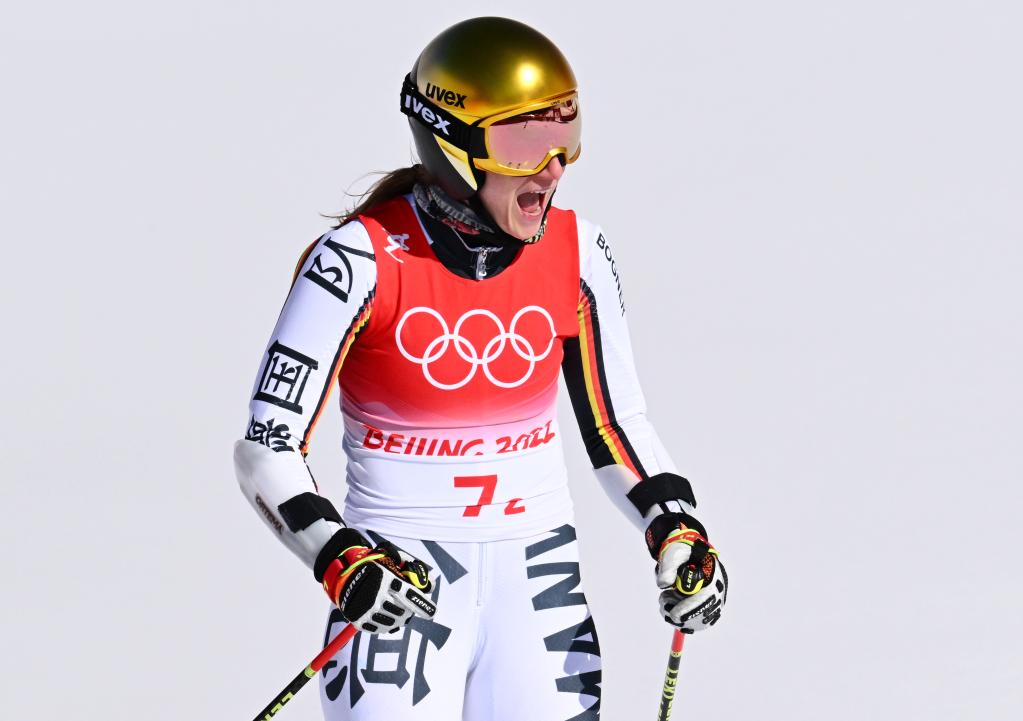 Lena Duerr of Germany reacts during the alpine skiing mixed team parallel final of Beijing 2022 Winter Olympics at National Alpine Skiing Centre in Yanqing District, Beijing, capital of China, Feb. 20, 2022. (Xinhua/Zhang Chenlin)
