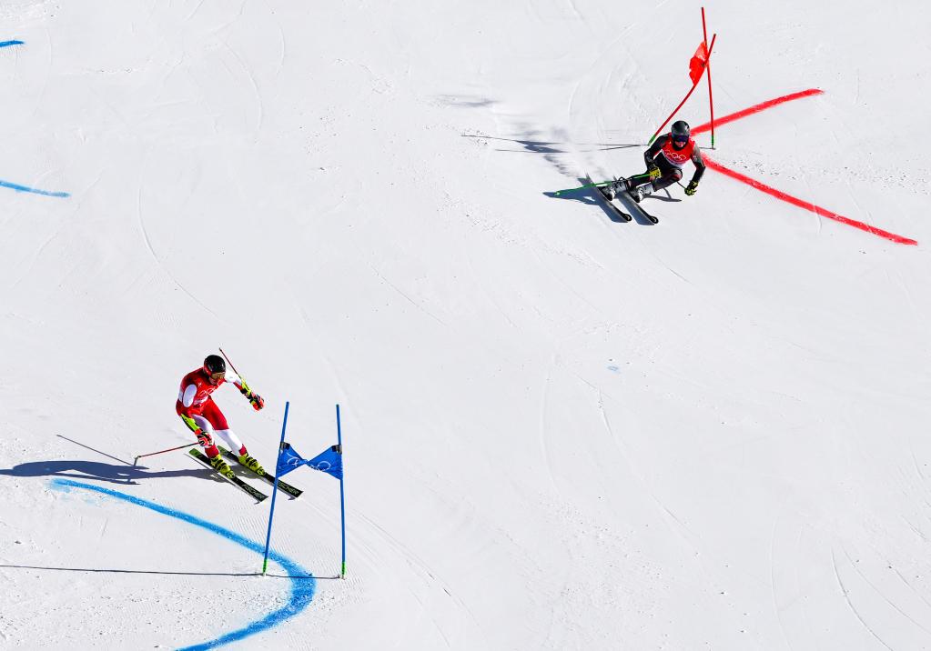 Stefan Brennsteiner (L) of Austria and Timon Haugan of Norway compete during the alpine skiing mixed team parallel semifinal of Beijing 2022 Winter Olympics at National Alpine Skiing Centre in Yanqing District, Beijing, capital of China, Feb. 20, 2022. (Xinhua/Lian Zhen)