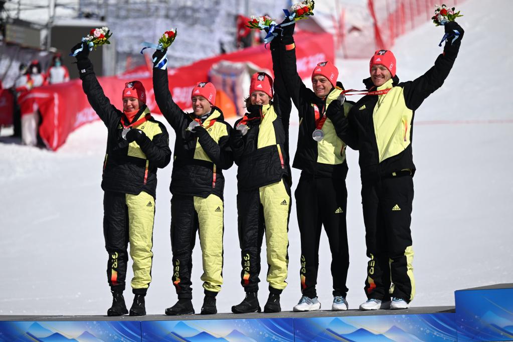 Team Germany pose for photos during the awarding ceremony after the alpine skiing mixed team parallel final of Beijing 2022 Winter Olympics at National Alpine Skiing Centre in Yanqing District, Beijing, capital of China, Feb. 20, 2022. (Xinhua/Chen Bin)