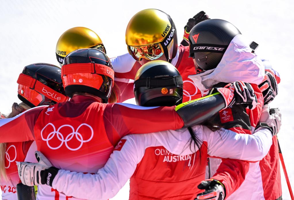 Athletes of Team Austria celebrate winning after the alpine skiing mixed team parallel final of Beijing 2022 Winter Olympics at National Alpine Skiing Centre in Yanqing District, Beijing, capital of China, Feb. 20, 2022. (Xinhua/Lian Zhen)