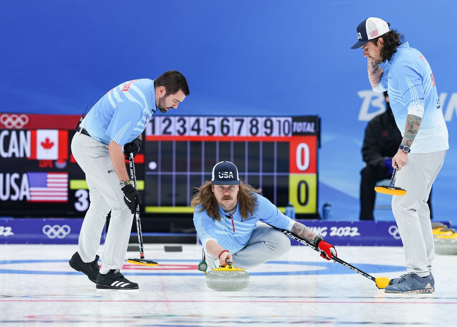 Matt Hamilton (C) of the United States curls the stone during the man's bronze medal game of the Beijing 2022 Winter Olympics, Feb.18, 2022. (Xinhua/Wang Jingqiang)