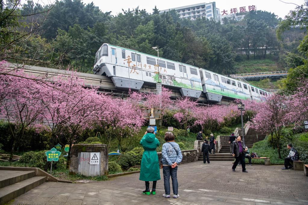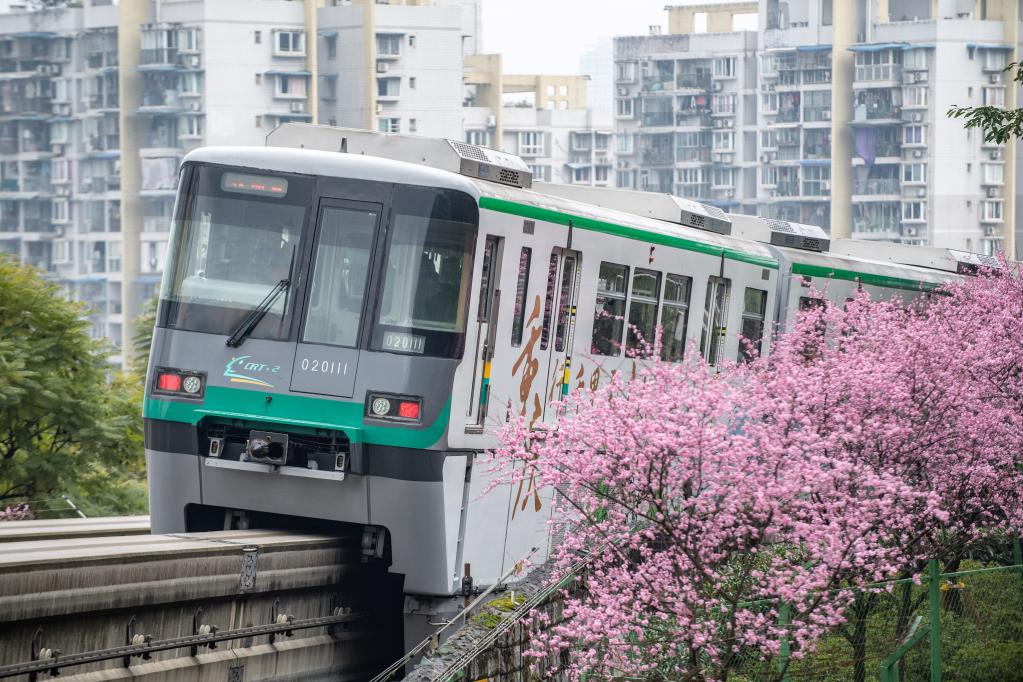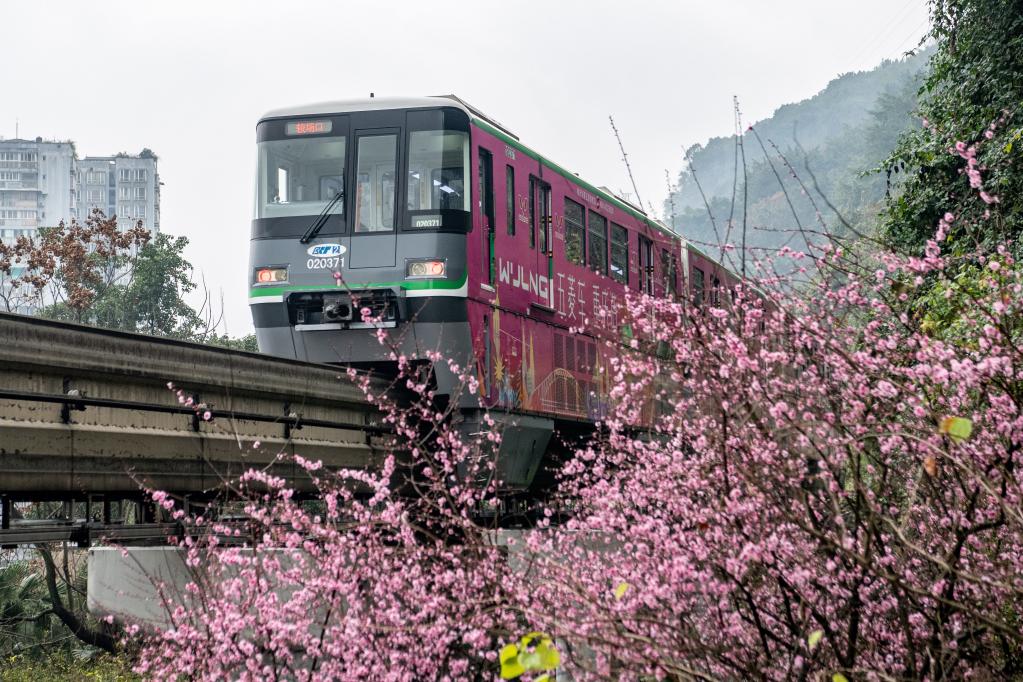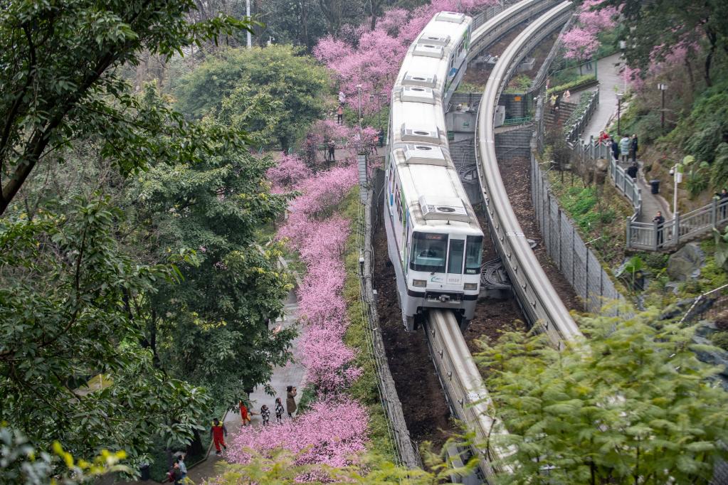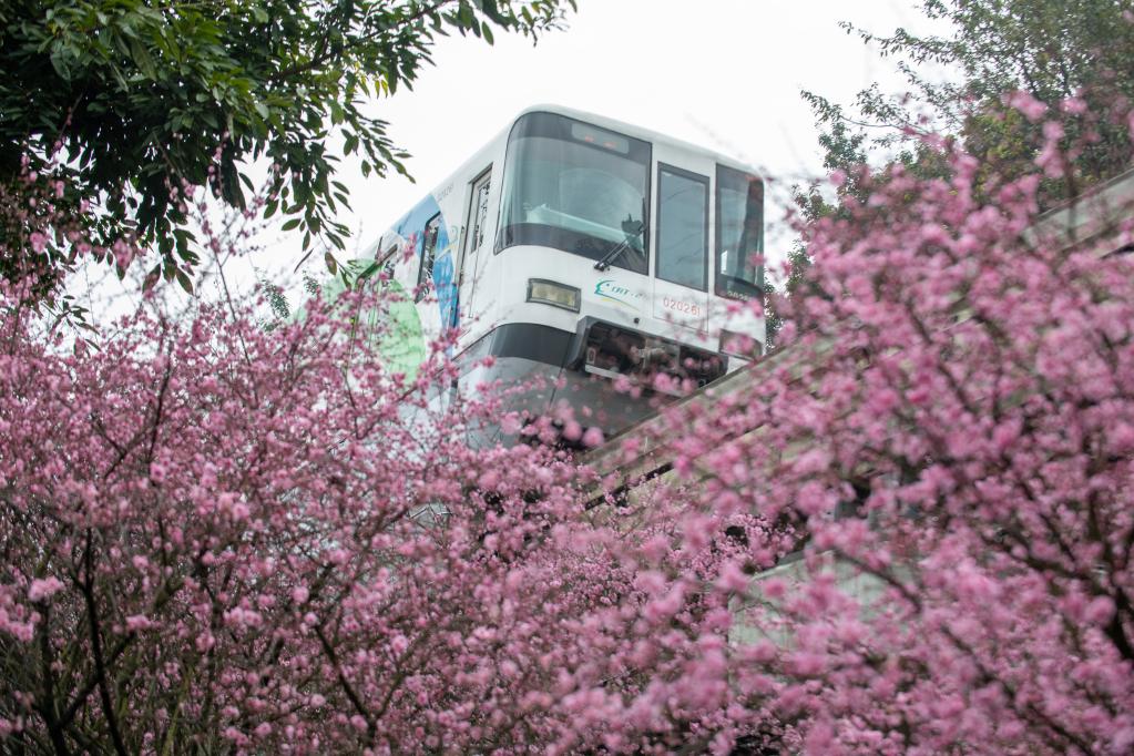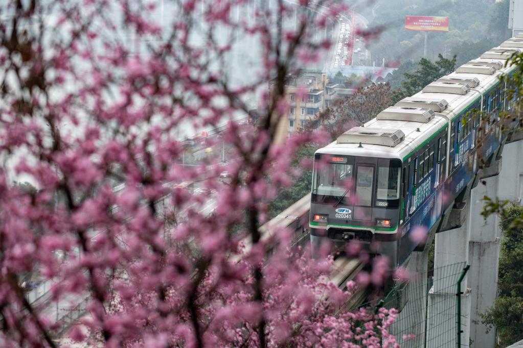 A train runs past blooming flowers along Liziba Station of Chongqing Rail Transit Line 2 in southwest China's Chongqing Municipality, Feb. 20, 2022. (Xinhua/Tang Yi)