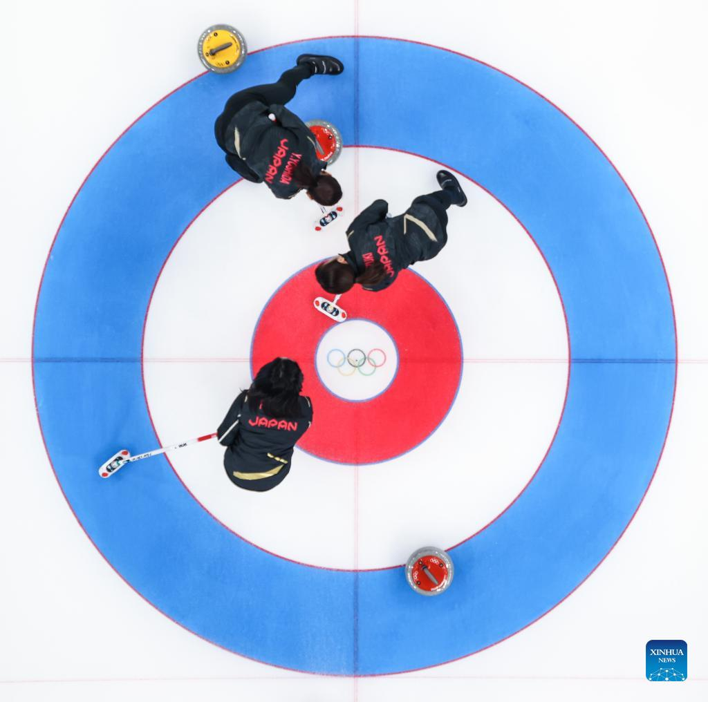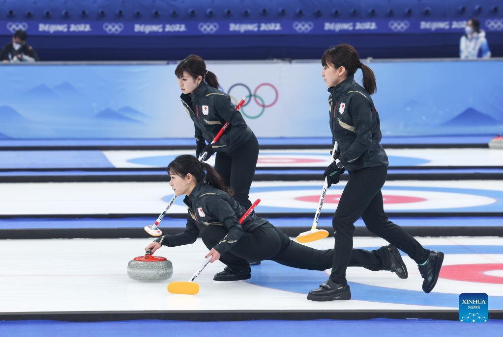 Yoshida Yurika (C) of Japan competes during the curling women's gold medal game of Beijing 2022 Winter Olympics at National Aquatics Centre in Beijing, capital of China, Feb. 20, 2022. (Xinhua/Wang Jingqiang)