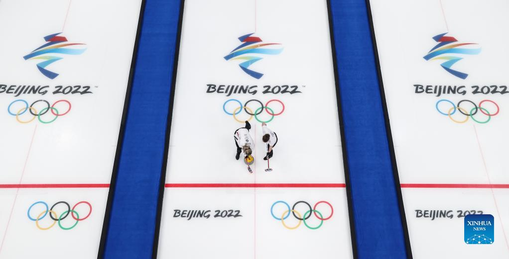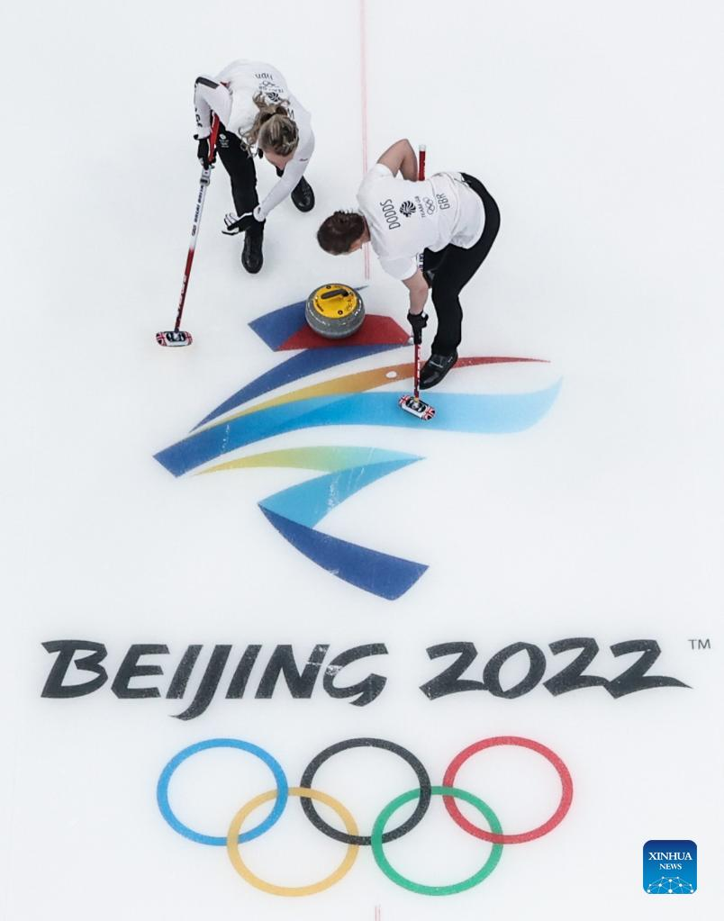 Jennifer Dodds (top) of Great Britain competes during the curling women's gold medal game of Beijing 2022 Winter Olympics between Japan and Great Britain at National Aquatics Centre in Beijing, capital of China, Feb. 20, 2022. (Xinhua/Yang Lei)