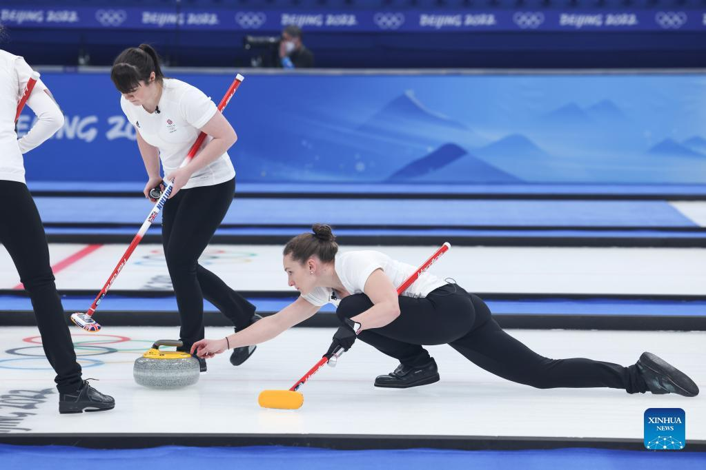 Jennifer Dodds (1st R) of Great Britain curls the stone during the curling women's gold medal game of Beijing 2022 Winter Olympics at National Aquatics Centre in Beijing, capital of China, Feb. 20, 2022. (Xinhua/Wang Jingqiang)