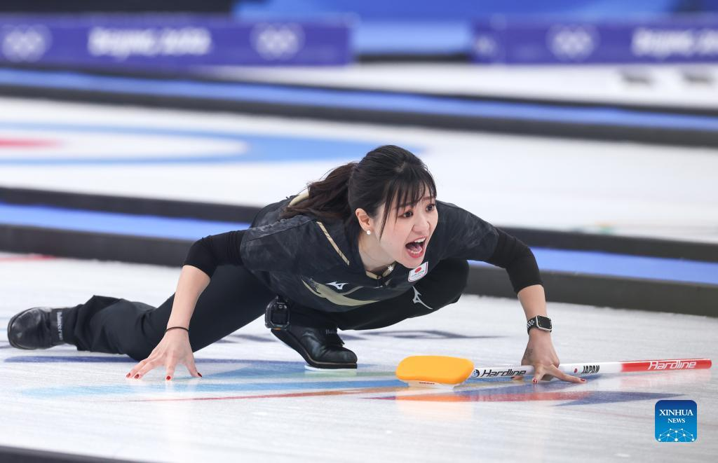 Yoshida Chinami of Japan competes during curling women's gold medal game of Beijing 2022 Winter Olympics at National Aquatics Centre in Beijing, capital of China, Feb. 20, 2022. (Xinhua/Wang Jingqiang)