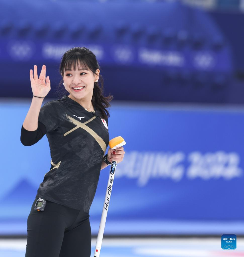 Fujisawa Satsuki of Japan competes during the curling women's gold medal game of Beijing 2022 Winter Olympics at National Aquatics Centre in Beijing, capital of China, Feb. 20, 2022. (Xinhua/Wang Jingqiang)