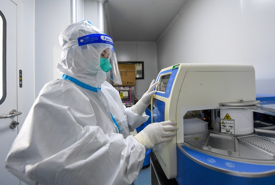 A medical worker operates a sampling device inside a COVID-19 testing laboratory in Hohhot, north China's Inner Mongolia Autonomous Region, Feb. 20, 2022. (Xinhua/Peng Yuan)
