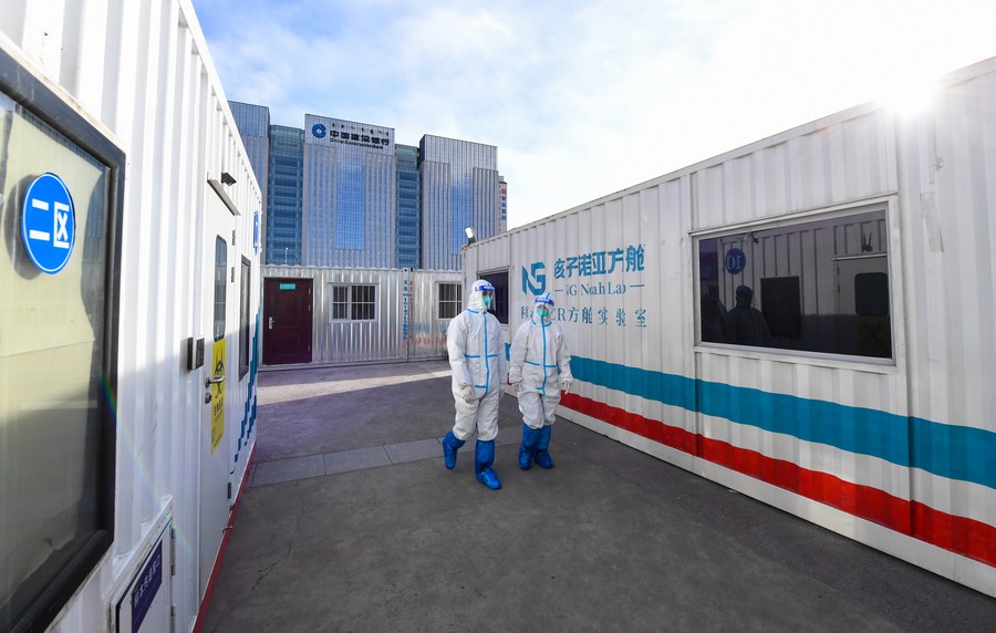Medical workers walk outside a COVID-19 testing laboratory in Hohhot, north China's Inner Mongolia Autonomous Region, Feb. 20, 2022. (Xinhua/Peng Yuan)