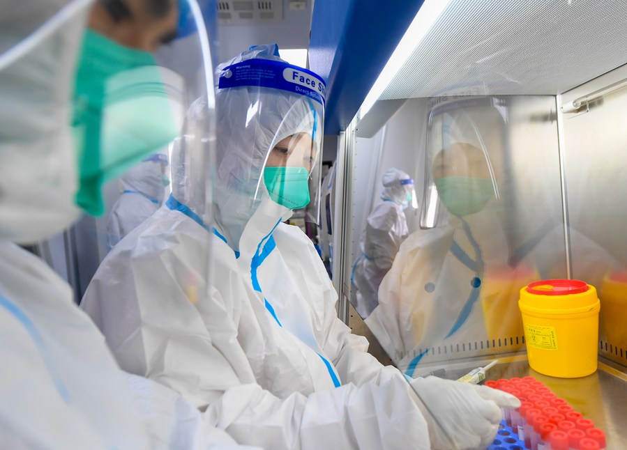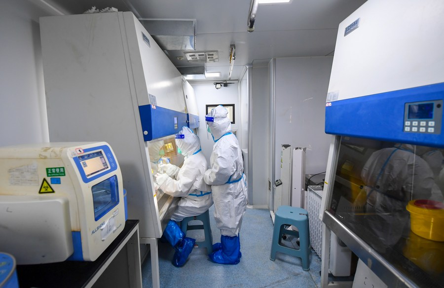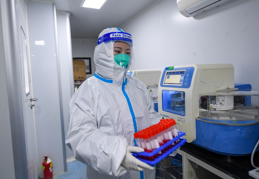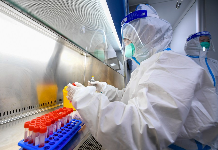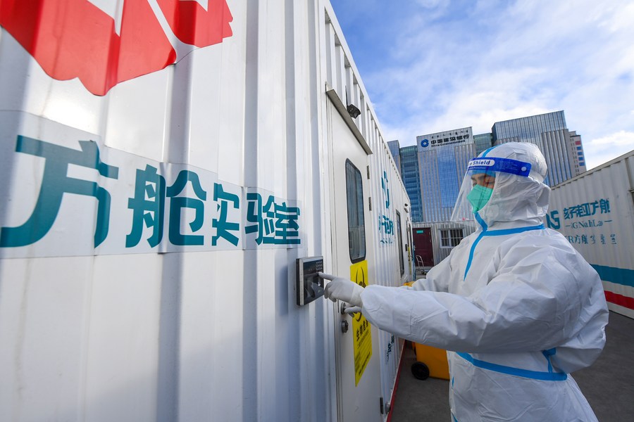 A medical staff member works inside a COVID-19 testing laboratory in Hohhot, north China's Inner Mongolia Autonomous Region, Feb. 20, 2022. (Xinhua/Peng Yuan)