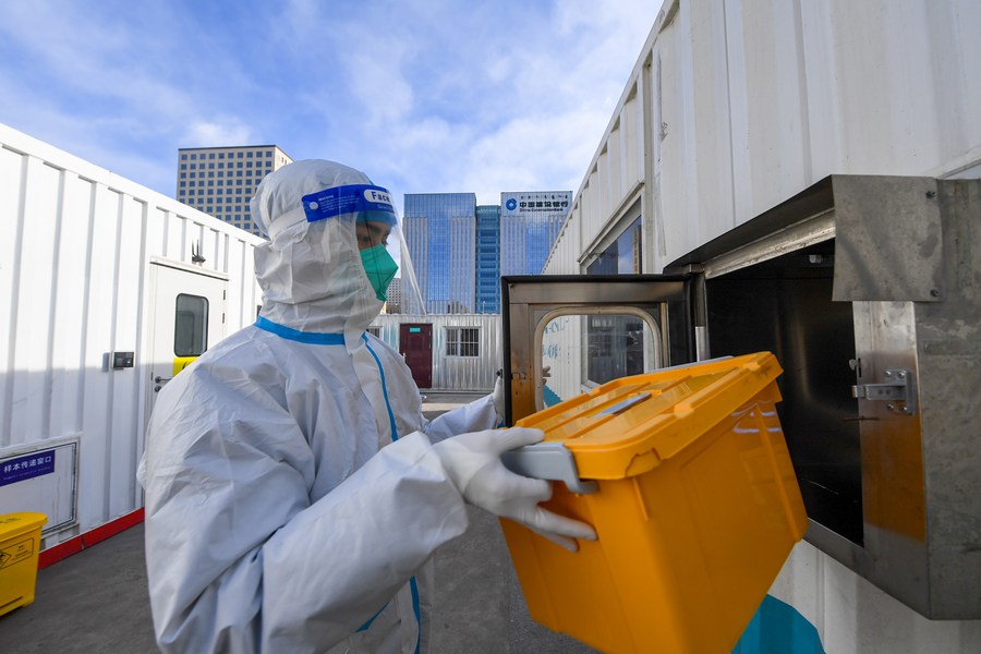 A medical worker delivers COVID-19 test samples through the window of a testing laboratory in Hohhot, north China's Inner Mongolia Autonomous Region, Feb. 20, 2022. (Xinhua/Peng Yuan)