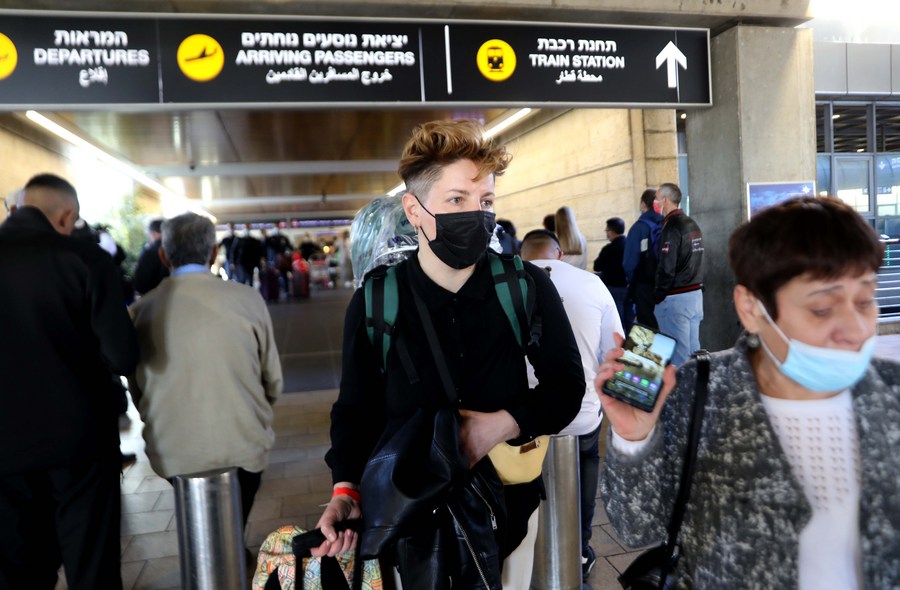 Passengers walk with their luggage as they arrive at Israel's Ben Gurion Airport in Tel Aviv, Feb. 13, 2022. (Photo by Gil Cohen Magen/Xinhua)