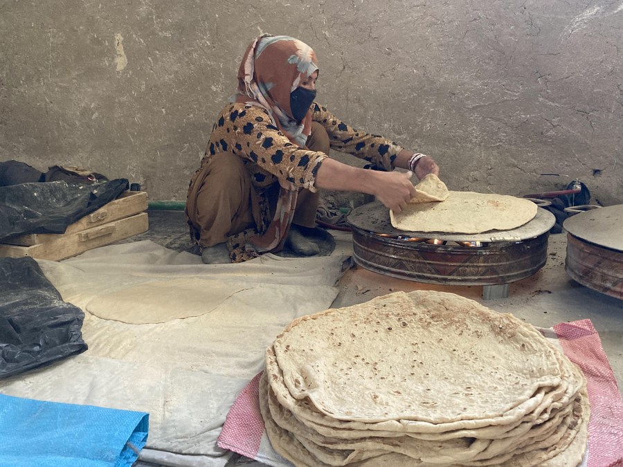 An Afghan woman cooks at a bakery in Kandahar city, southern Afghanistan, Feb. 20, 2022. (Photo by Arghand/Xinhua)