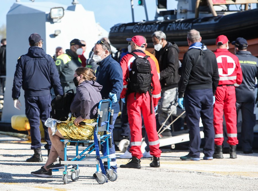 Passengers of the "Euroferry Olympia" of Grimaldi Lines are seen arriving at the port of Corfu island, Greece, Feb. 18, 2022. (Photo by Stamatis Katapodis/Xinhua)
