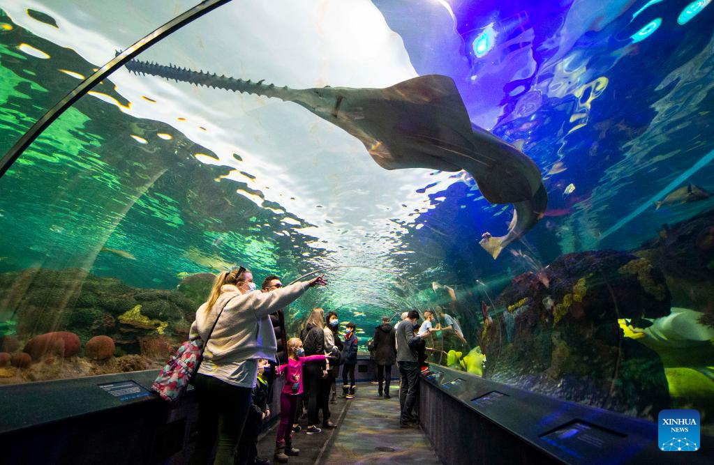 Visitors look at alewives in a water tank at Ripley's Aquarium of Canada in Toronto, Canada, on Feb. 21, 2022. The Ripley's Aquarium of Canada drew many families to celebrate Family Day on Monday. (Photo by Zou Zheng/Xinhua)