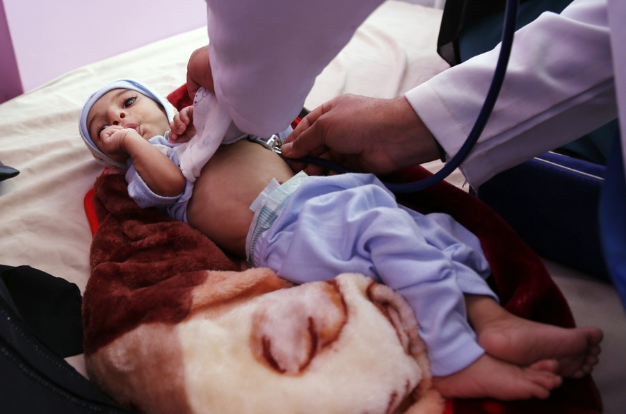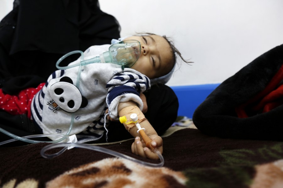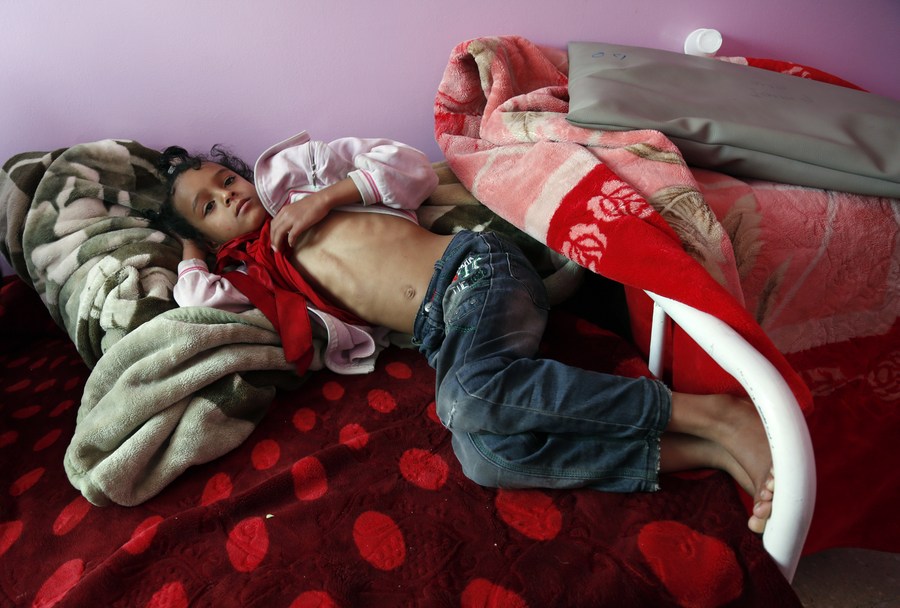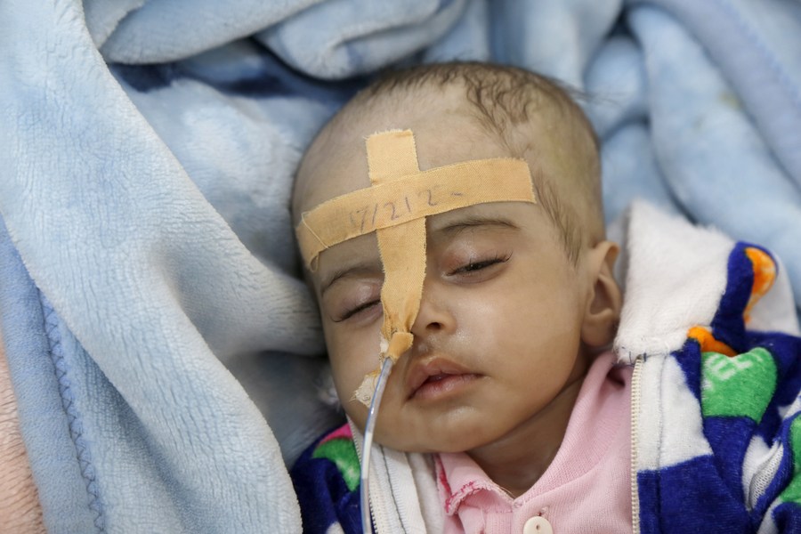 A Yemeni malnourished child lies on a bed as he receives medical treatment at the malnutrition treating ward in Al-Sabeen hospital in Sanaa, Yemen, on Feb. 21, 2022. (Photo by Mohammed Mohammed/Xinhua)