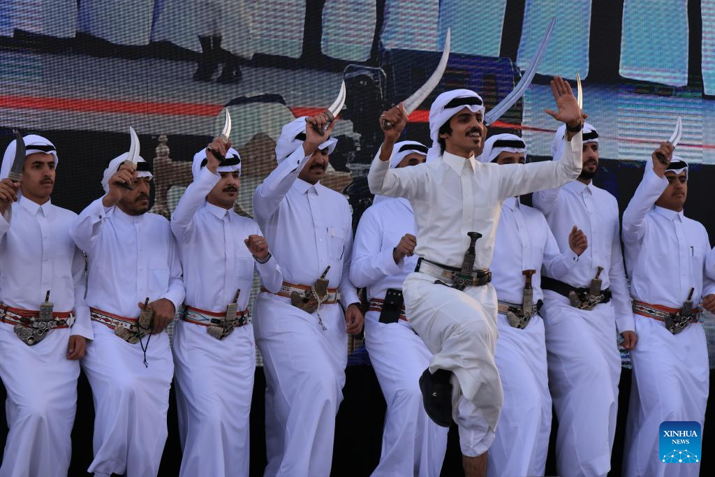 People wearing traditional clothes perform a traditional dance during the first kingdom's Founding Day celebrations in Abha, Saudi Arabia, on Feb. 22, 2022. (Xinhua/Wang Haizhou)