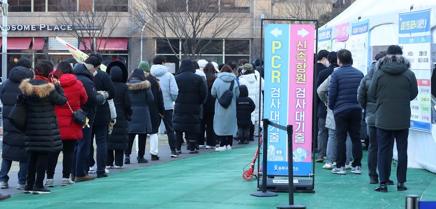 People wait for COVID-19 test at a makeshift testing site in Seoul, South Korea, Feb. 18, 2022. (NEWSIS/Handout via Xinhua)