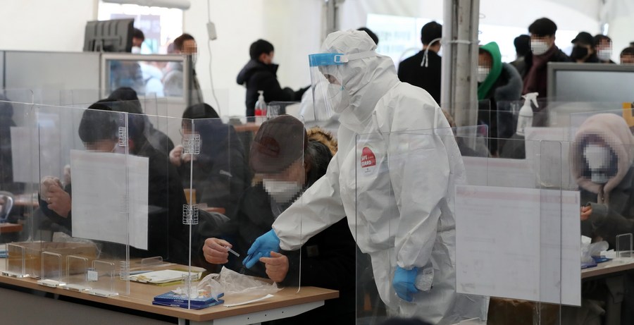 People take COVID-19 self-test at a makeshift testing site in Seoul, South Korea, Feb. 18, 2022. (NEWSIS/Handout via Xinhua)