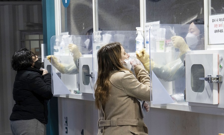 Medical workers take swab samples from people for COVID-19 tests at a makeshift testing site in Seoul, South Korea, Feb. 16, 2022. (Photo by James Lee/Xinhua)