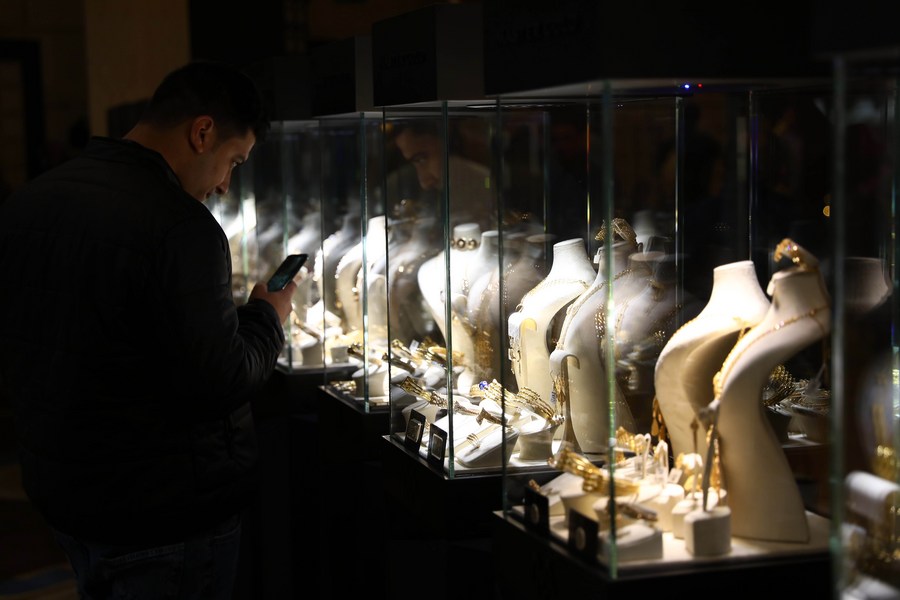 A man takes photos of jewelry during the Nebu expo for gold and jewelry in Cairo, Egypt, on Feb. 20, 2022. (Xinhua/Ahmed Gomaa)