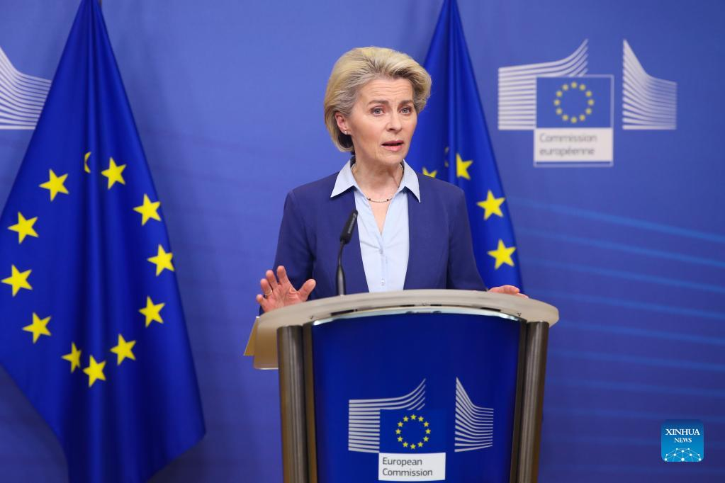 European Commission President Ursula von der Leyen makes a statement on the Ukraine issue in Brussels, Belgium, on Feb. 22, 2022. The European Union (EU) is ready to take further action against Russia if it continues to escalate the crisis, von der Leyen warned here on Tuesday. (Xinhua/Zheng Huansong)
