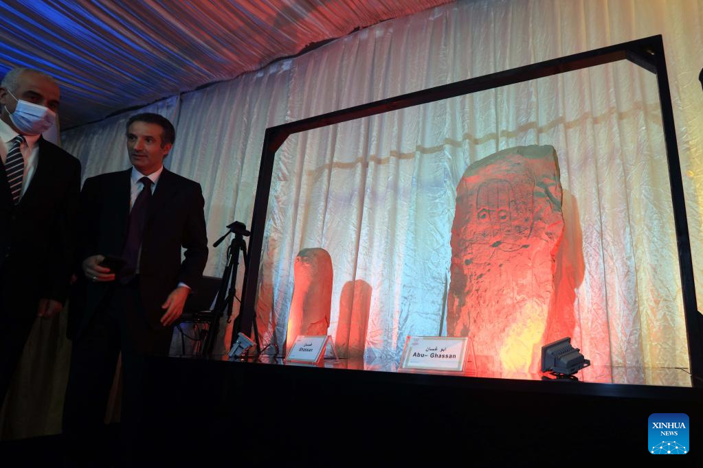 Photo taken on Feb. 22, 2022 shows carved standing stones discovered at an archeological site during a press conference in Amman, Jordan. (Photo by Mohammad Abu Ghosh/Xinhua)